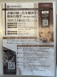 お知らせ学術活動のお知らせです。2026年2月・3月に開催される下記の学会にて、院長・はるか先生が講演および症例提供を行います。 ■ 2026年2月28日 日本獣医動物行動学会 第2回学術集会(教育講演) 演題:「行動診療、一人 […]