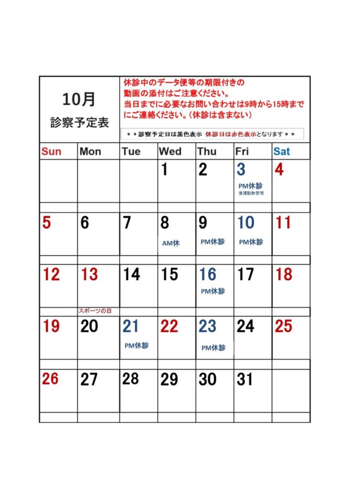 【2025年10月】診察日カレンダーと休診のお知らせ|にいがたペット行動クリニック