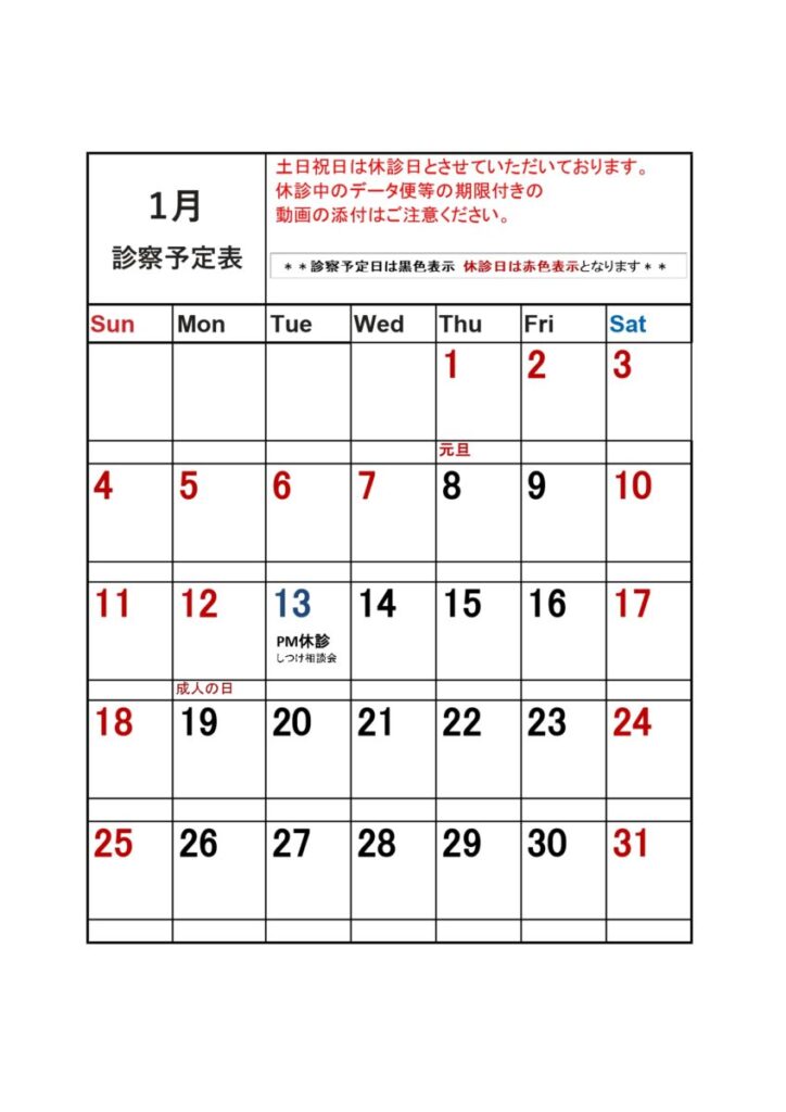 【2026年1月】診察日カレンダーと休診のお知らせ|にいがたペット行動クリニック