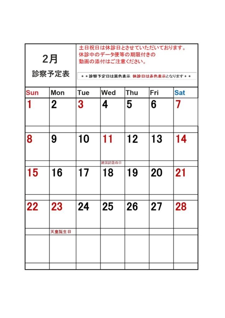 2026年2月の診察日カレンダーと休診情報をお知らせいたします。
